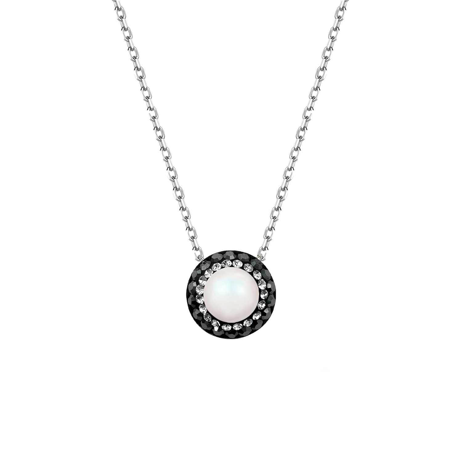 Ασημένιο 925 γυναικείο κολιέ ροζέτα με μαύρες και λευκές πέτρες γύρο από κεντρικό Μαργαριτάρι. Η διάμετρος της ροζέτας είναι 12mm. Το κολιέ διαθέτει 45 εκατοστά αλυσίδα με 5 εκατοστά επιπλέον προέκταση.