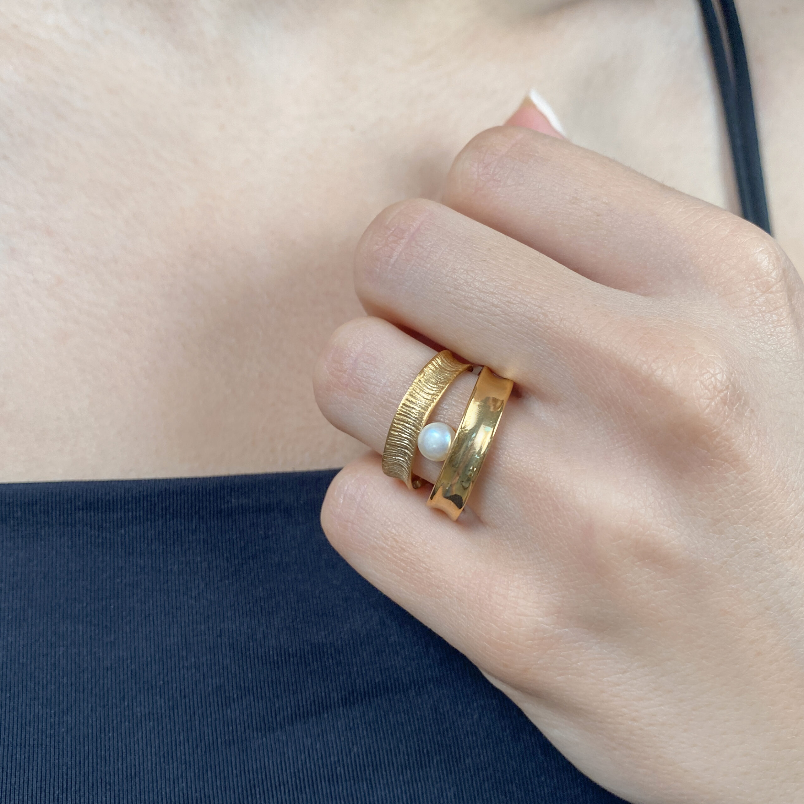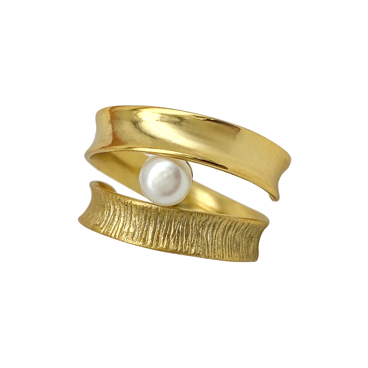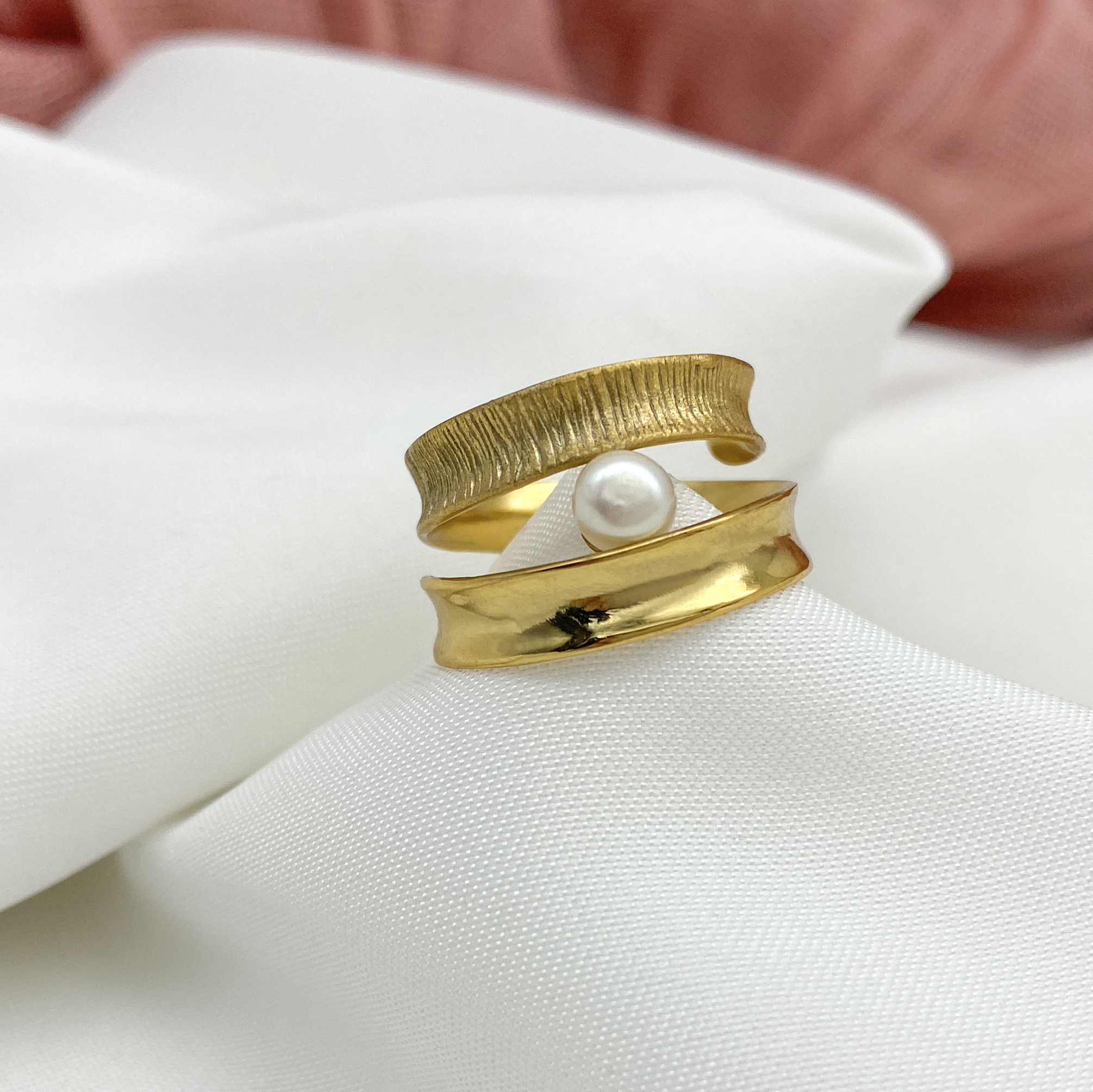 Χειροποίητο δαχτυλίδι με διπλή βέρα από ασήμι 925 με 18Κ επιχρύσωμα και μαργαριτάρι γλυκού νερού.