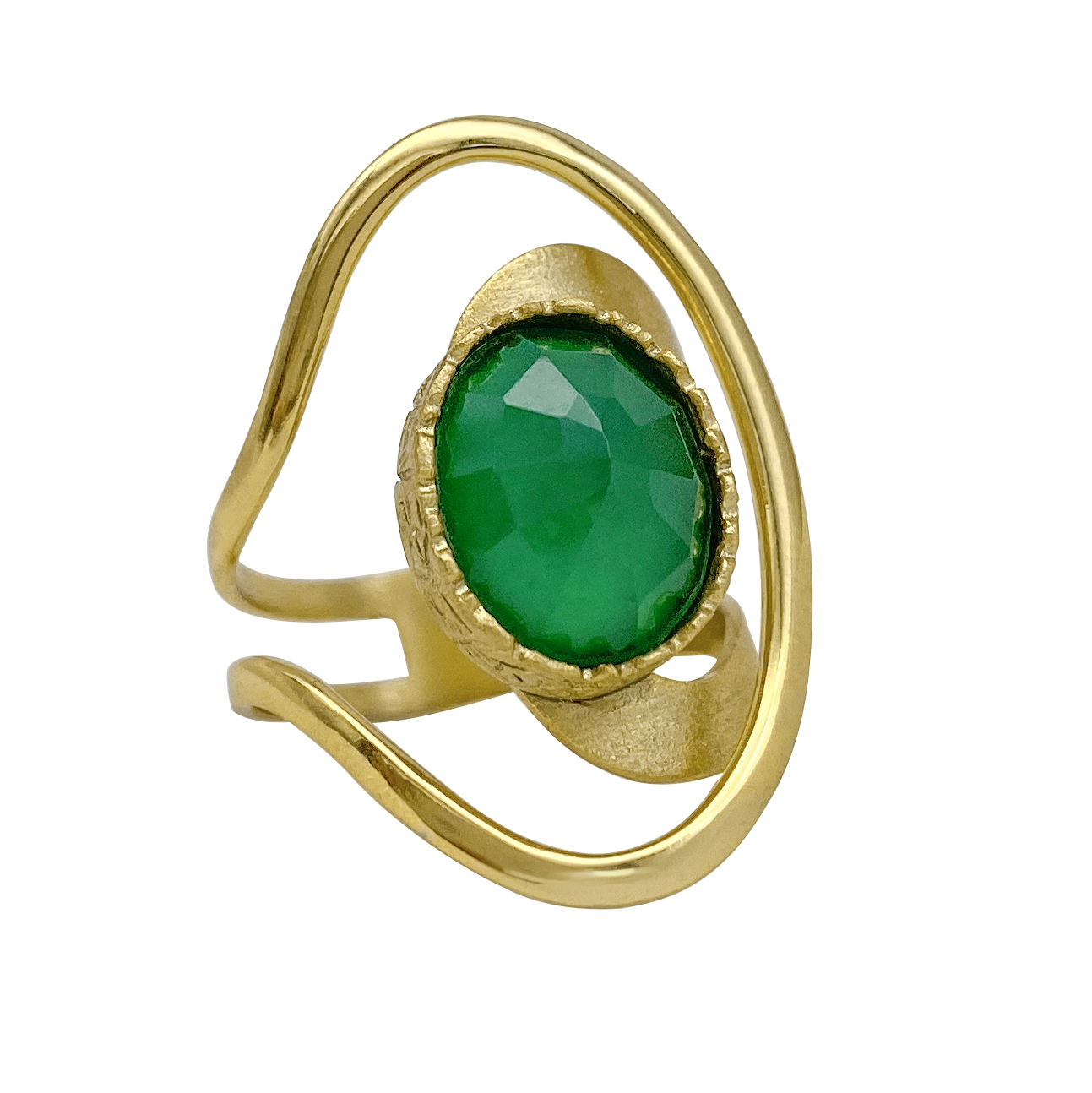 Χειροποίητο δαχτυλίδι με ιδιαίτερο σχήμα από ασήμι 925 με 18Κ επιχρύσωμα και πράσινο αχάτη.