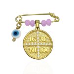 Χρυσό 14Κ φυλαχτό, κωνσταντινάτο διπλής όψης για μωράκι σε παραμάνα με ματάκι και ροζ πέτρες. Το κωνσταντινάτο είναι 1,35 γραμμάρια και μπορεί να περαστεί σε αλυσίδα για τον λαιμό.